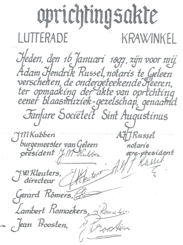 Er waren al langer plannen om een eigen muziekgezelschap op te richten. De omringende dorpen zoals Spaubeek, Stein en Beek hadden al een korps en ook de inwoners van Oud-Geleen wisten sinds 1866 al van toeten én blazen. Het alsmaar groeiende Lutterade kon dus niet achterblijven en op initiatief van enkele bewoners, burgemeester Kubben en pastoor Linssen ging een oprichtingscomité aan de slag om een muziekkorps op te richten. Het comité kwam op 16 januari 1897 in café Stevens in vergadering bij elkaar om de definitieve oprichting af te ronden. Een belangrijk agendapunt van deze eerste vergadering zal ongetwijfeld financiën zijn geweest. Het comité had vooraanstaande personen zoals de heren Bieberstein, D’Ansembourg, Michiels van Kessenich en Martens bereid gevonden een financiële bijdrage te leveren en een huis-aan-huis collecte in Lutterade leverde fl 82,33 op, nu ongeveer 35 euro. Een startkapitaal was er, niets stond een oprichting meer in de weg en vanaf 16 januari 1897 was Fanfare Sociëteit Sint Augustinus een feit.